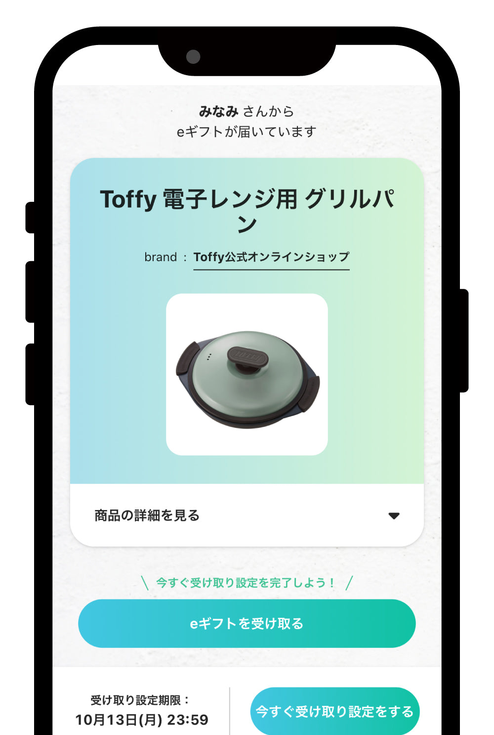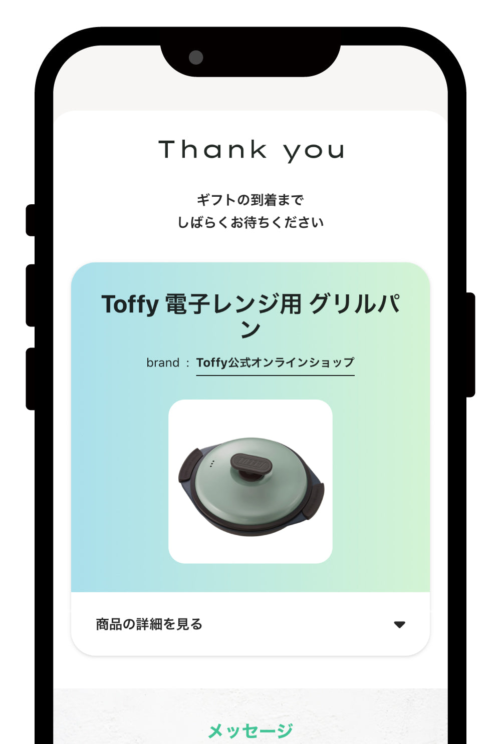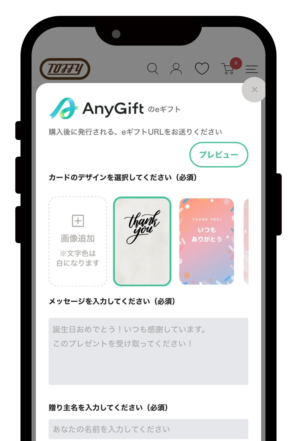 カート内の「eギフト設定」でデジタルメッセージカードを選択の上、メッセージと贈り主名を入力し、ご注文ください。注文完了後に表示される受け取り用ページのURLをメールまたはLINEなどのSNSで贈り先の方へご連絡ください。(受け取り用ページのURLは、ご注文確認メールからもご確認いただけます)
