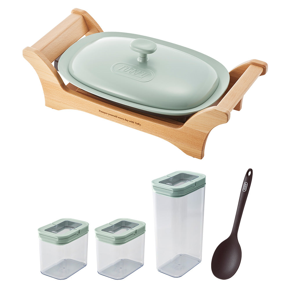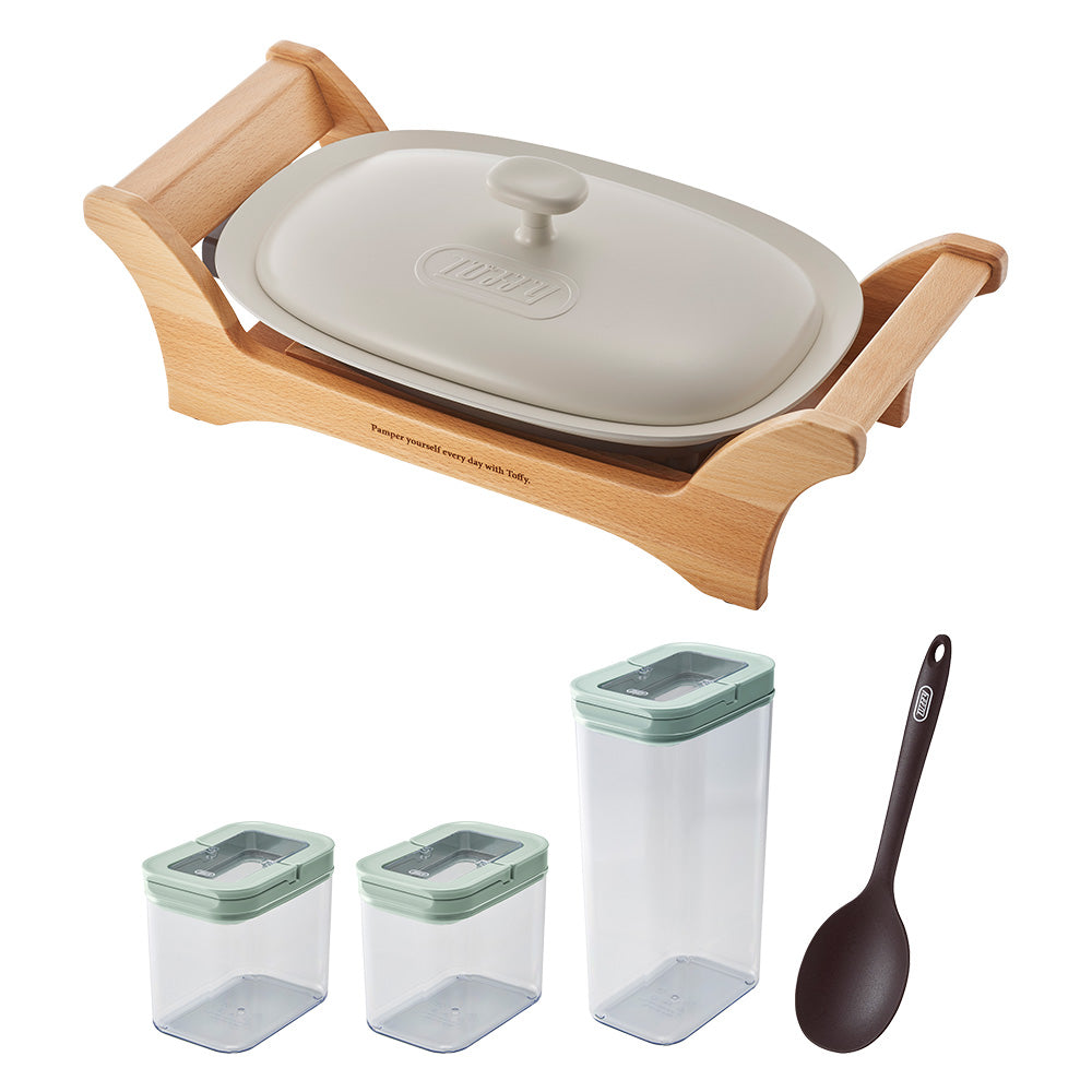 木製の台に乗せたヒーター一体構造”のグリルプレートと便利なキッチン雑貨がセットになったお得な福袋です。